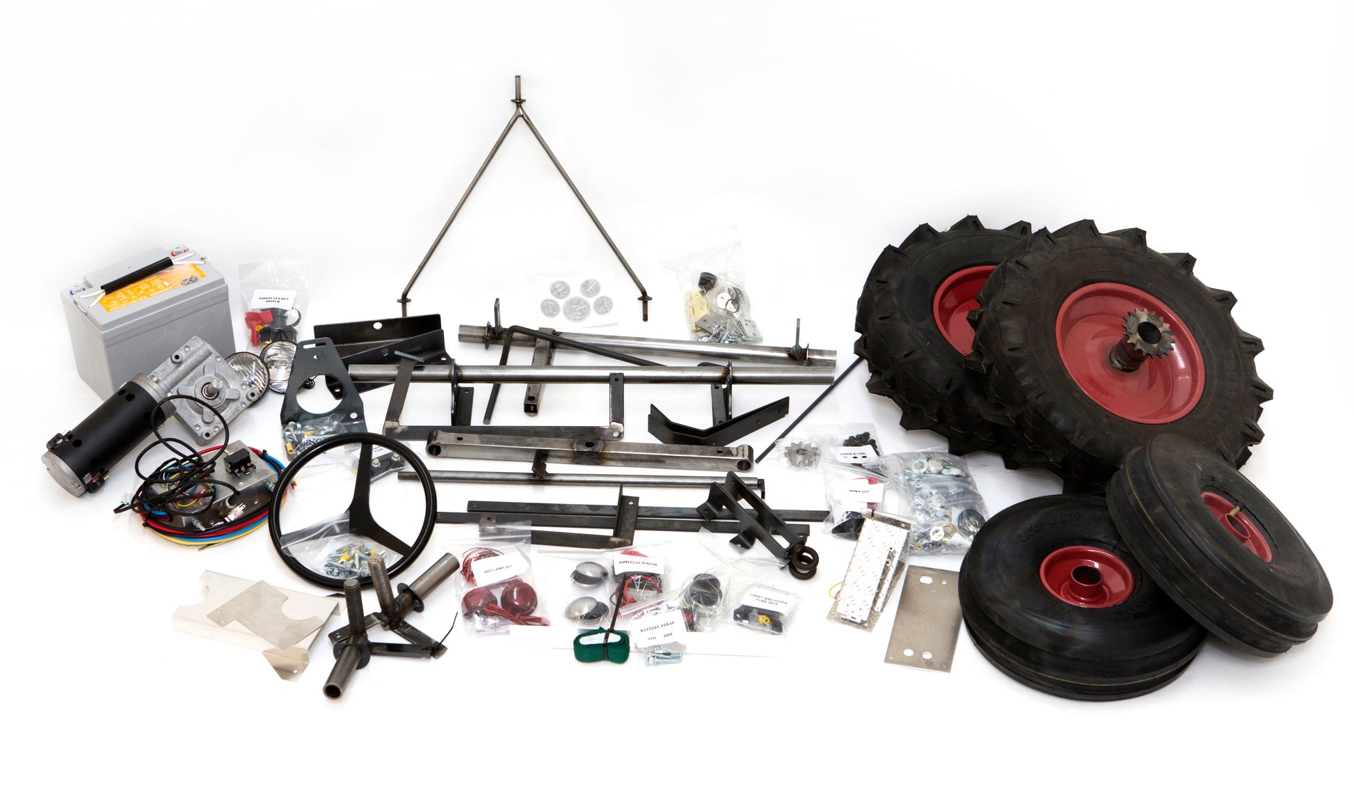 Basic kit includes manual, steel fabrication set, chunky tyres, drive kit (single motor and battery), speed control kit, bodywork and additional components (lights, electric horn, wheel caps, dash and dashboard stickers). Excludes body panels and paint