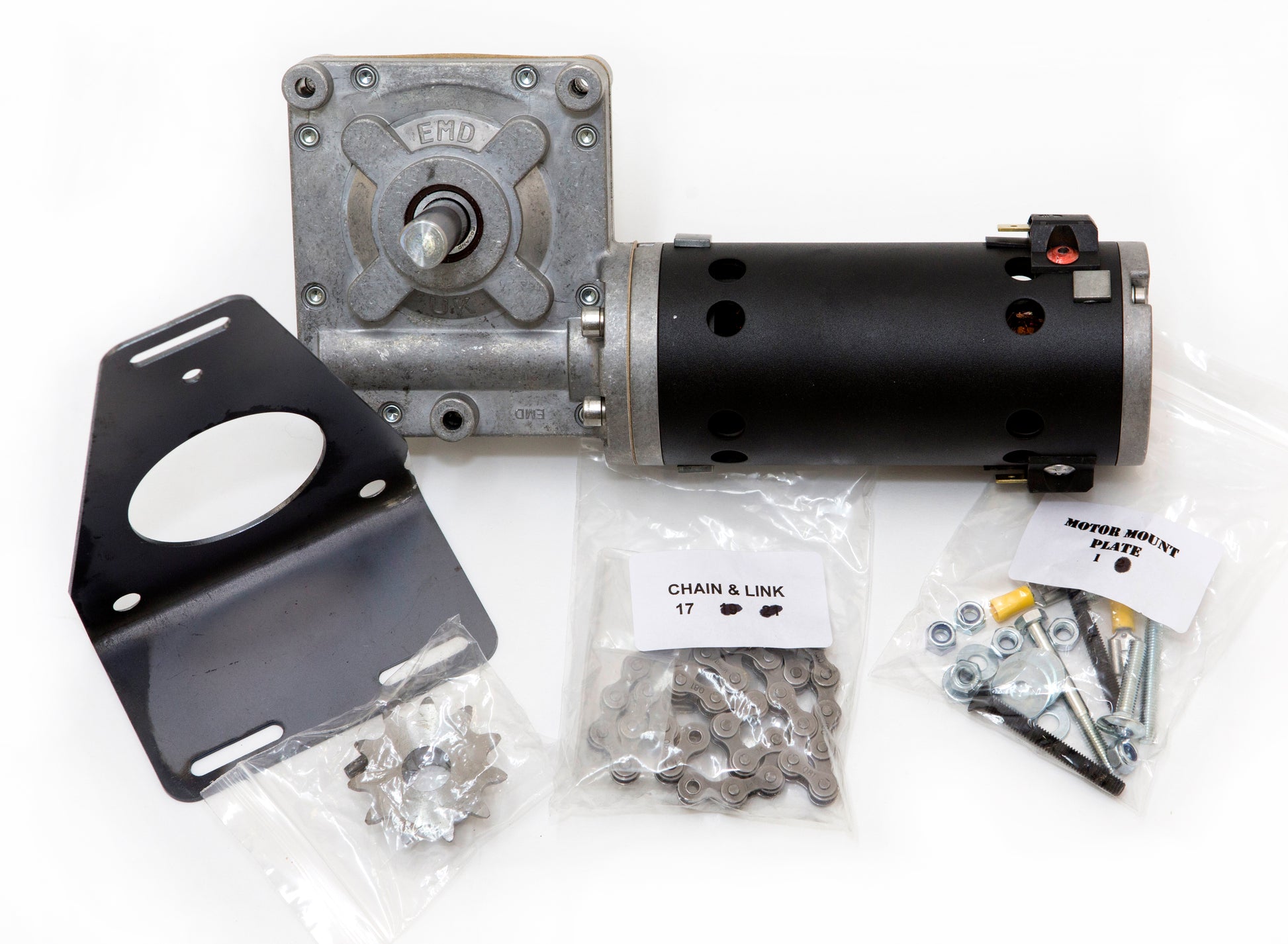 Single motor drive set contains 1 electric motors and gearbox, motor mounting plates and bolt sets, motor drive sprocket, single set chain and link. The single motor option is suitable for the TL1, TL2, TL3, MB43, Mayfair, MFR and DBR tractors. If you are building the Unihog you will need to purchase the twin motor options