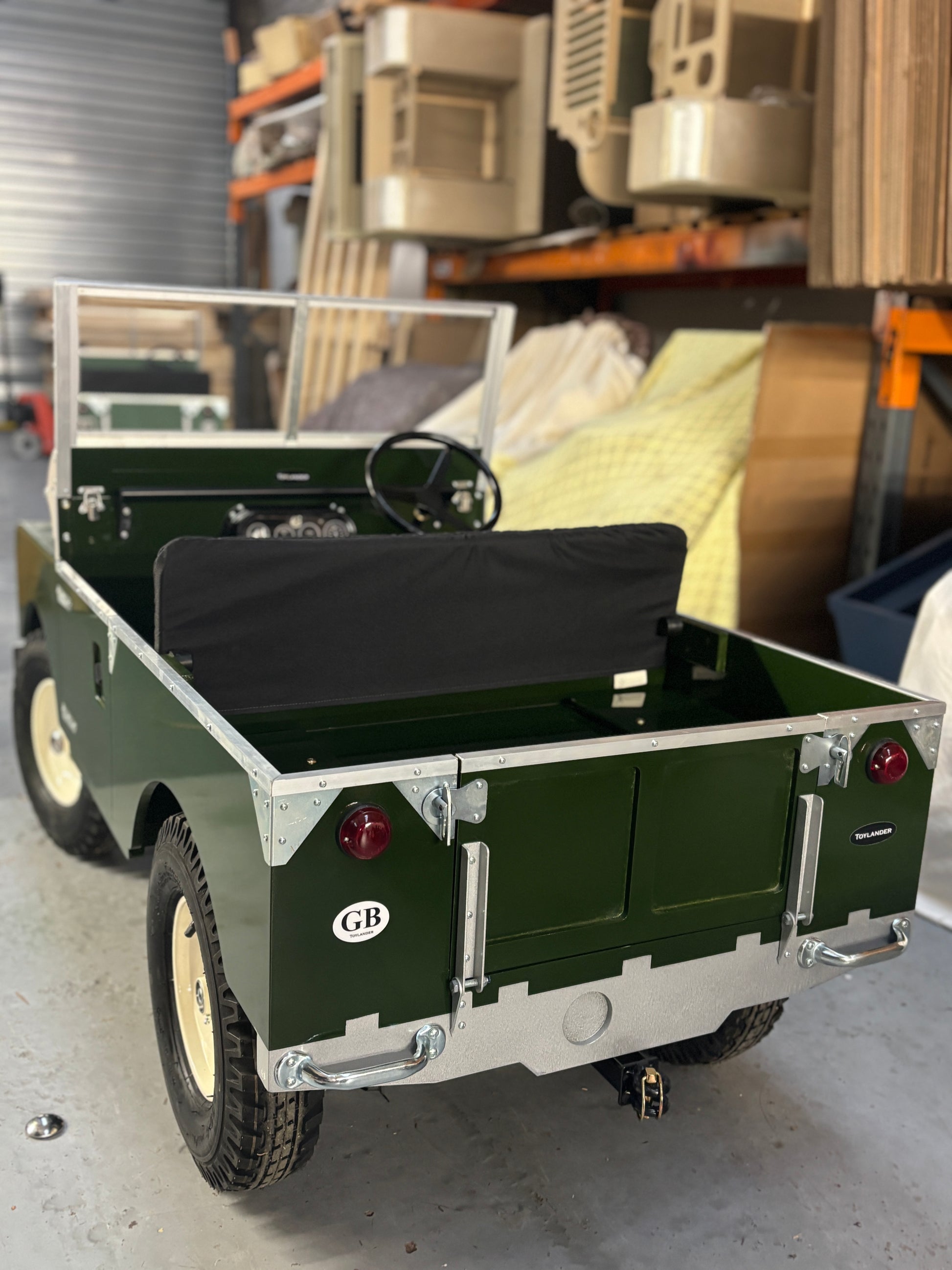 Toylander 1 in dark bronze green - available now in stock. Our faithful tribute is packed with realistic features to delight your learner driver, including forward/reverse gears, speed control, brake, lights, folding windscreen, opening tailgate, pneumatic tyres and horn. The tough monocoque body is spacious enough for one adult and two children, with a safe top speed of 5mph/8kph. Size; 1.6m long x 72cm wide, weight 110kg. Power 24v, 2x12v batteries. Automatic brake and throttle speed control. Number plates of your choice. Comes with a quilted seat cushion and a battery charger fully ready to drive.